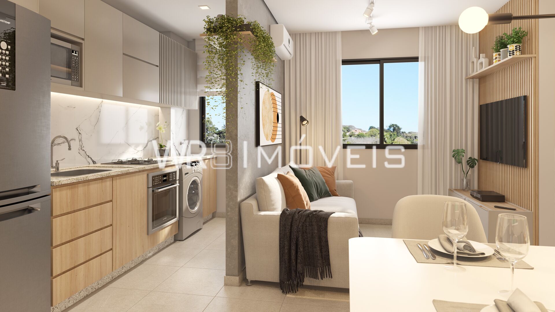 - Cozinha integrada à sala com layout aberto, mais amplitude e praticidade